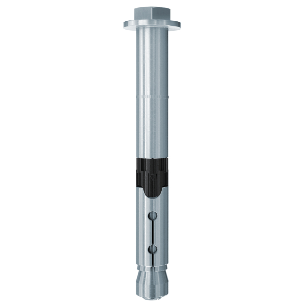 Der fischer Hochleistungsanker FH II B mit Gewindebolzen ist ein Hülsenanker aus galvanisch verzinktem Stahl. Der Anker wird in der zeitsparenden Durchsteckmontage gesetzt. Beim Anziehen des Ankers wird der Konus in die Spreizhülse gezogen und verspannt diese gegen die Bohrlochwand. Der schwarze Kunststoffring verhindert, dass sich der Anker mitdreht, und nimmt den Anzugsschlupf auf. Das Anbauteil wird dadurch an den Verankerungsgrund gezogen. Der fischer Hochleistungsanker FH II B mit Gewindebolzen bestens geeignet, um in gerissenem und ungerissenem Beton Gitter, Stahlkonstruktionen und Kabeltrassen zu befestigen.
