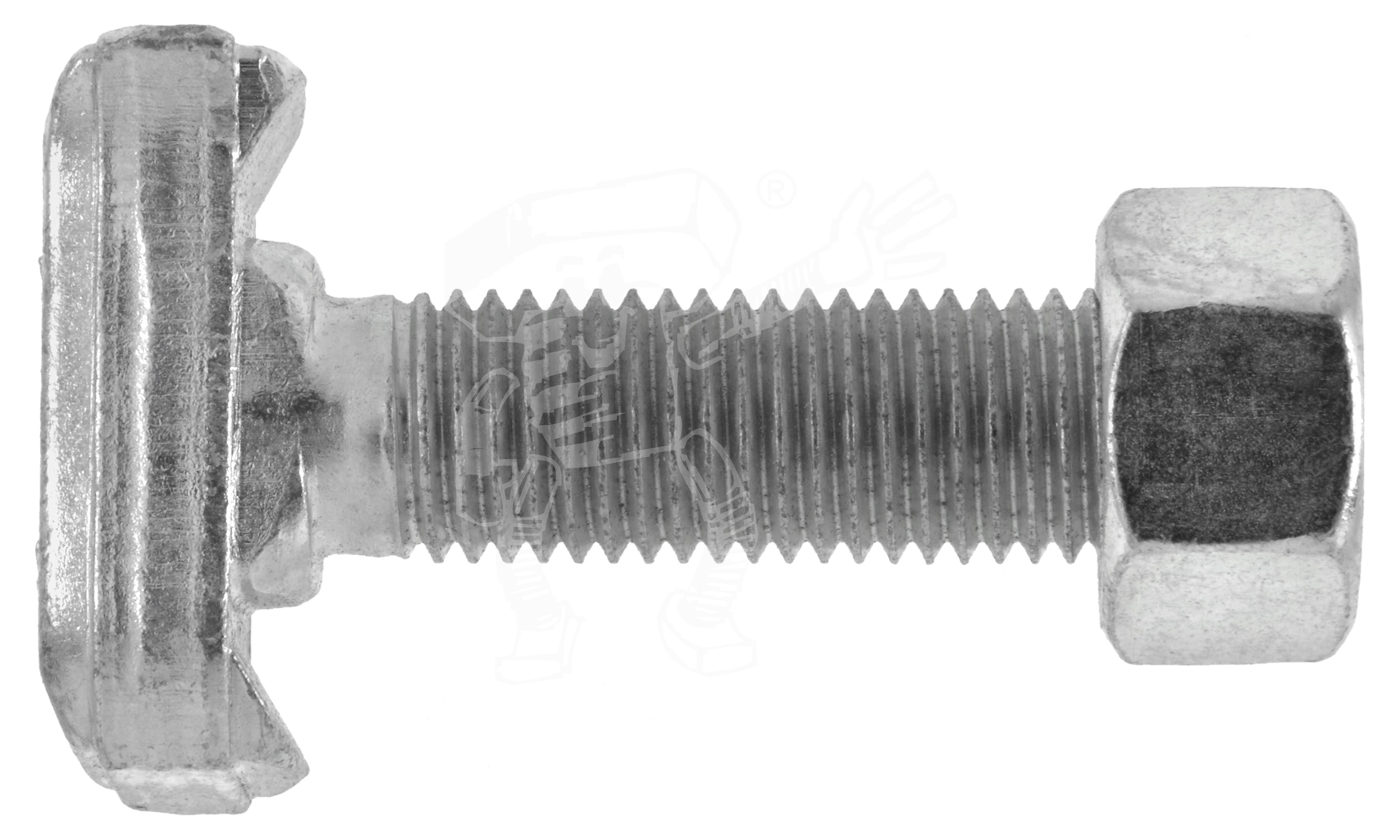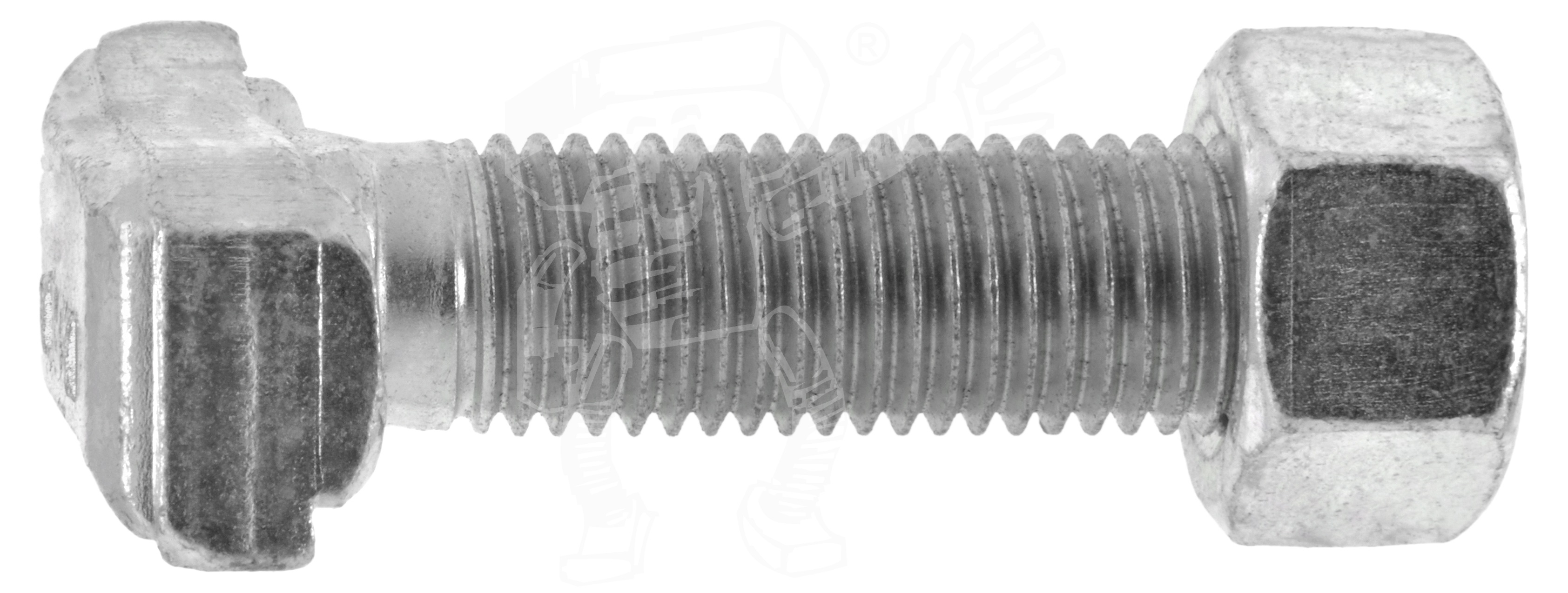Hammerkopf-Halfen-Schrauben, TYP 28/15, mit Mutter, für Profile 28/15 - 28/12 - 28/28 - 26/26 sind Sonderschraube mit metrischem Regelgewinde (M), die einen speziellen als Haken ausgeformten Kopf haben. Halfen® ist dabei ein Markenname des bekanntesten Herstellers. Der Hakenkopf wird in eine passende Profil-Schiene eingeführt und gleitet in diesem Profil. Halfenschrauben oder Hammerkopfschrauben werden besonders im Stahl- und Anlagen-, Maschinen- und Fahrzeugbau verwendet. Sie sind kompatibel mit Halfenschrauben und werden von uns in den Werkstoffen Stahl blank und Stahl galvanisch verzinkt angeboten. Damit werden Stahlhallen, Balkone, Maschinen oder Anlagen verschraubt. Diese Schrauben werden mit passender Sechskantmutter (nicht Gleitmutter!) geliefert.