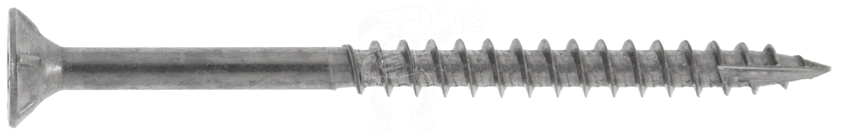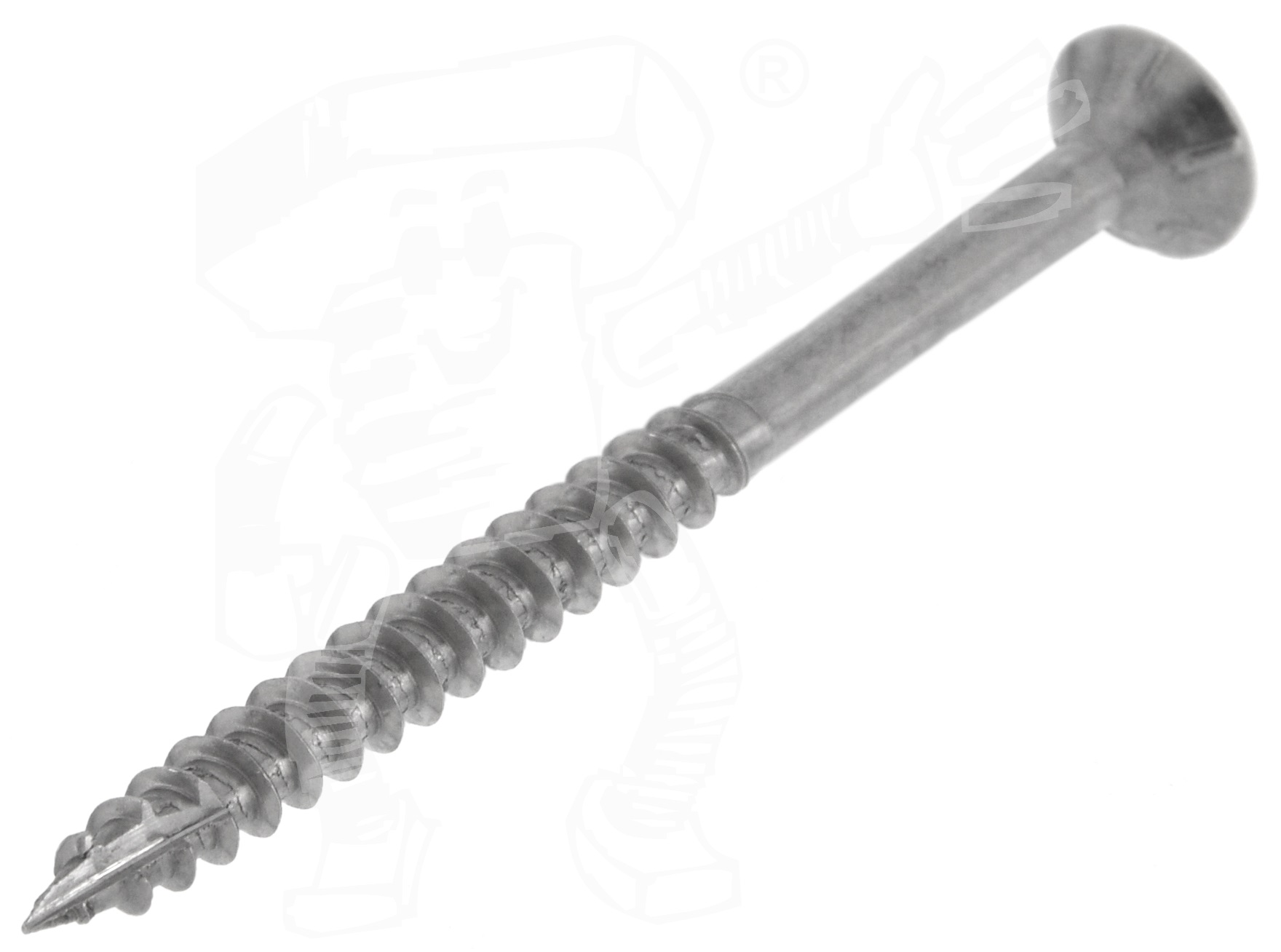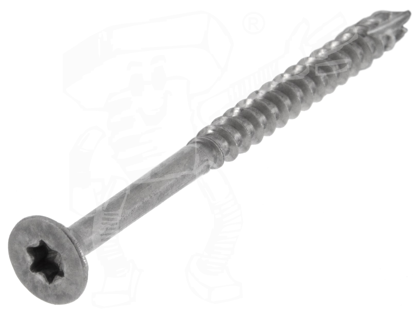 Werkstoff für Senkkopf-Spanplattenschrauben mit Fräsrippen, Schneidkerbe, Innensechsrund (TX) ist Edelstahl Rostfrei A2 und A4. A2 ist beständig gegen Kontakt mit der Luft oder kurzzeitigem Wasserkontakt. Rostfrei A4 ist sogar hochsäurebeständig und widersteht auch Salzwasser.